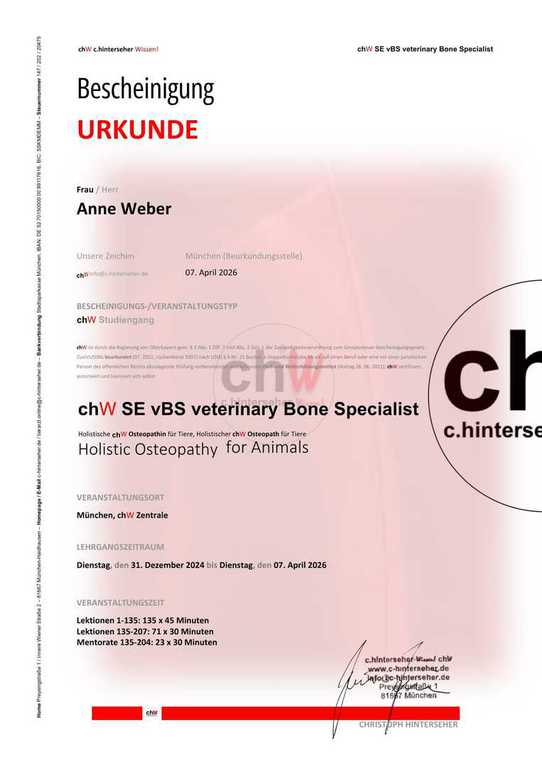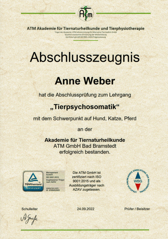 Tierheilpraktikerin, mit Fachausbildung Tierpsychosomatik (ATM)